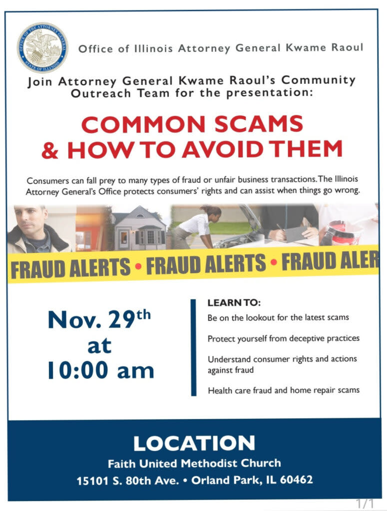 Join us on Saturday, November 29th at 10AM for a presentation from Illinois Attorney General Kwame Raoul’s Community Outreach Team, Common Scams and How to Avoid Them. https://www.faithumcop.org/2025/11/15/fraud-prevention-presentation/