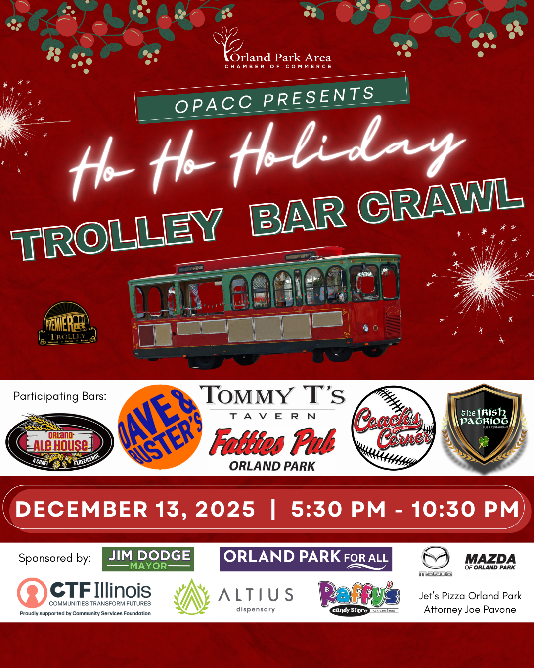 Ho Ho Holiday Trolley Bar Crawl Home Page Celebrate the holiday season with us on December 13th as we embark on a festive trolley ride through Orland Park! We'll be stopping at local pubs to enjoy the season's cheer. This fun event is a collaboration between the Chamber and several of our restaurant members. Whether you're a member or not, everyone is invited to join in the festivities! Trolleys will be stopping at all the participating restaurants starting at 5:30 pm until 10:30 pm. Participating restaurants: Dave & Buster's, Orland Ale House, Tommy T's Tavern, Fatties Pub, Coach's Corner and The Irish Patriot! We also offer a fantastic sponsorship opportunity—Santa’s Helper! This package includes: Signage on the trolleys, signage at the bars, shout-outs on the trolleys, logo on website and social media and allows you to provide handouts and swag on the trolleys or at the bars. A big thank you to our sponsors Altius Dispensary, Attorney Joe Pavone, CTF Illinois, Jet's Pizza, Mazda of Orland Park, Orland Park For All, Orland Park Mayor Jim Dodge, and Raffy’s Candy Store! -------------------------------------------------------------------------------- Enjoy this recap of the 2024 Ho Ho Holiday Trolley Bar Crawl Participating restaurants: Coach's Corner Dave & Buster's Fatties Pub Orland Ale House The Irish Patriot Tommy T's Tavern