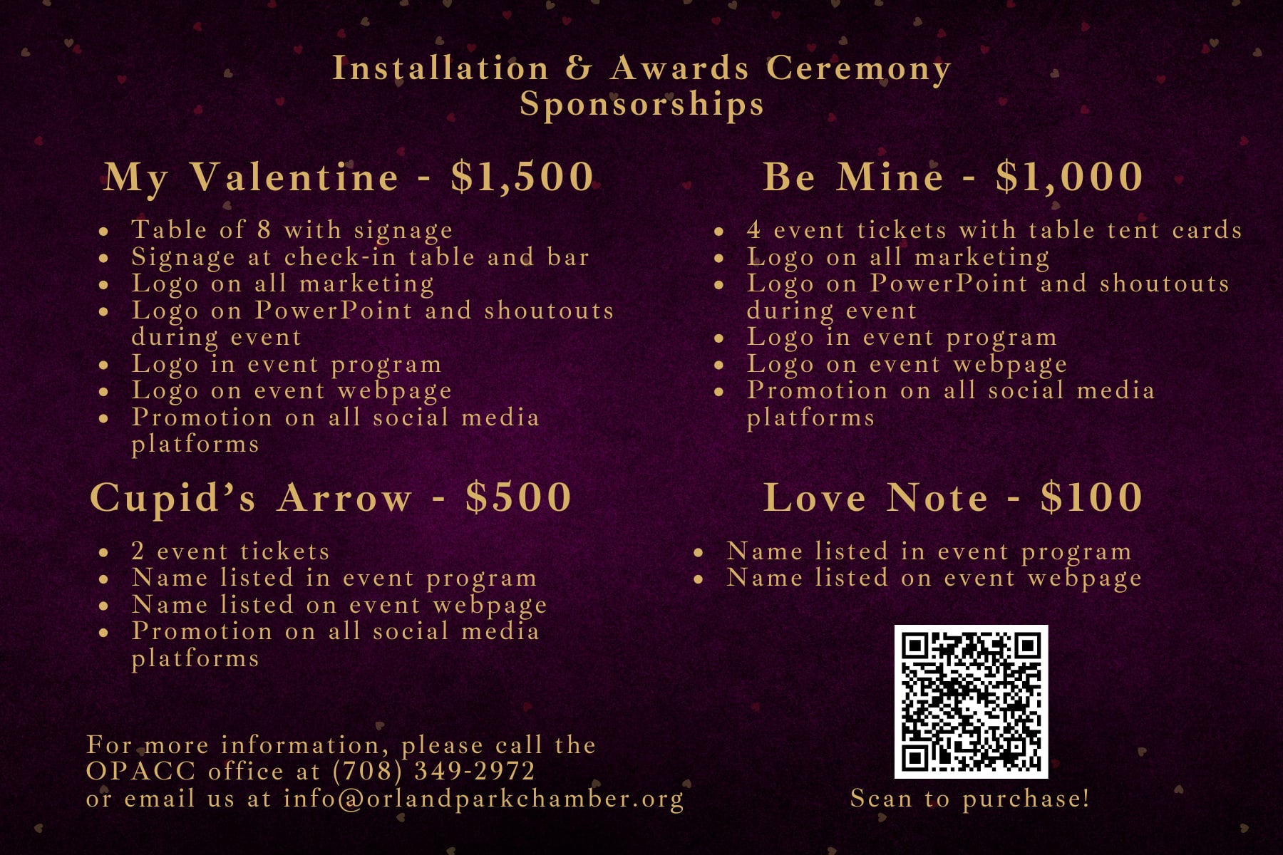 Installation & Awards Ceremony The Chamber’s annual installation brings together the business and nonprofit communities for an evening of celebration and networking. This event not only recognizes the achievements of the Chamber and its members, but also introduces new board leadership. We would love to hear your nominations and feedback on Chamber members who have made significant contributions over the past year. Your input matters! Submit your nominees here. Links: Official Press Release | 2024 Installation Highlights Dinner for 1 - $55 Thank you to our sponsors! "My Valentine" "Be Mine" "Cupid's Arrow" "Love Note"