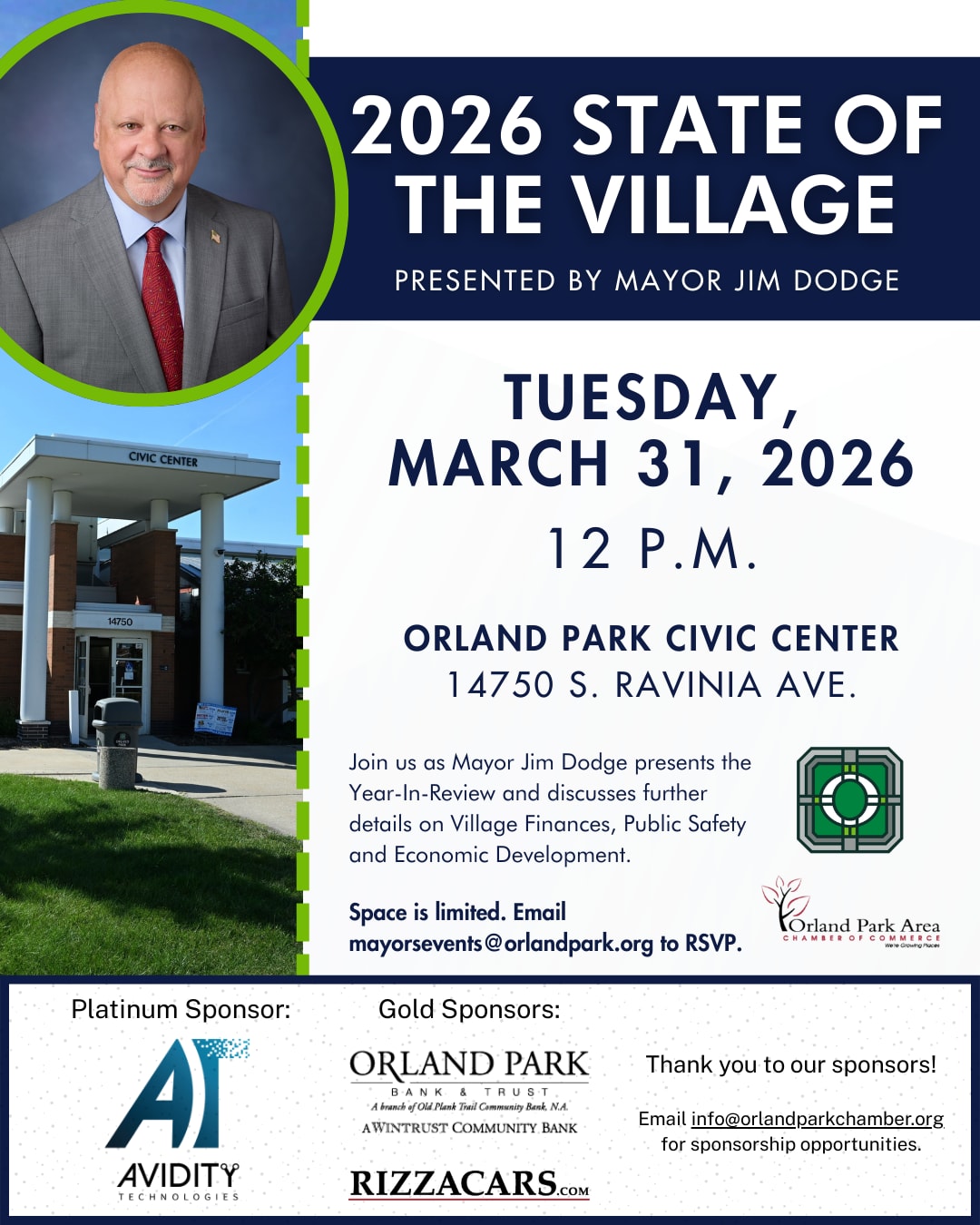 **Please RSVP by messaging mayorsevents@orlandpark.org.** Join us on Tuesday, March 31 at 12 p.m. for the annual State of the Village Address presented by Mayor Jim Dodge at the Orland Park Civic Center (14750 S. Ravinia Ave., Orland Park). This event is co-hosted with The Village of Orland Park. The annual address will highlight accomplishments from 2025 and outline priorities for the year ahead, including updates on Village finances, public safety initiatives and economic development efforts. “The State of the Village is an opportunity to reflect on what we have accomplished together and to share our vision for the future,” said Mayor Jim Dodge. “I look forward to discussing our progress and the work ahead as we continue moving Orland Park forward. ” The event is co-hosted by the Orland Park Area Chamber of Commerce and provides residents, business leaders and community partners an opportunity to hear directly from the Mayor about the Village’s direction and priorities. Village Staff, residents, members of the business community and local media are encouraged to attend; however, seating is limited. Lunch will be served. For those unable to attend, the event will be live-streamed on the Village YouTube channel. A big thanks to our sponsors! **Please RSVP by messaging mayorsevents@orlandpark.org.** Please RSVP by messaging