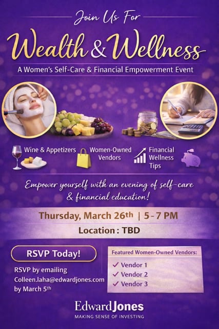 Empower yourself with an evening of self-care and financial education! Please contact Colleen.laha@edwardjones.com for more information regarding registration and/or vendor details.