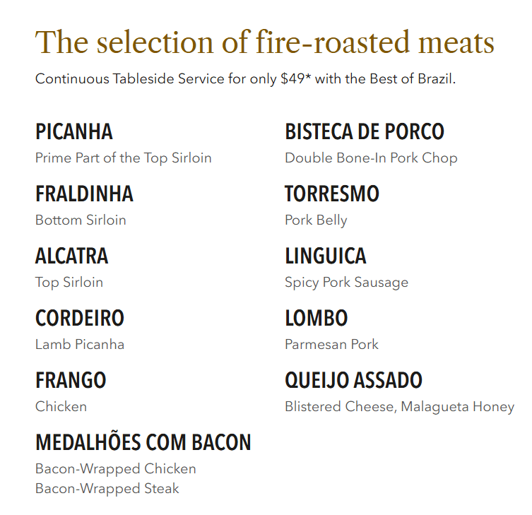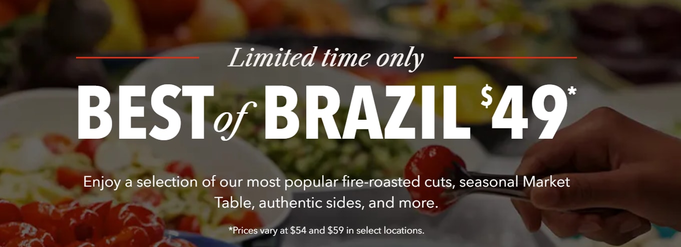 Back by popular demand! BEST OF BRAZIL, the guest-favorite experience that invites diners to savor some of the best cuts Brazil has to offer - all for $49. Best of Brazil – Limited-Time Menu: For $49* per person, guests can enjoy a curated menu featuring Fogo’s most celebrated fire-roasted proteins, fresh Market Table selections, and signature Brazilian sides. The Best of Brazil menu highlights the Culinary Art of Churrasco with premium cuts butchered, roasted over an open flame and carved tableside by gaucho chefs. Expiration Date : 6/1/2026 Promo Code : BEST OF BRAZIL