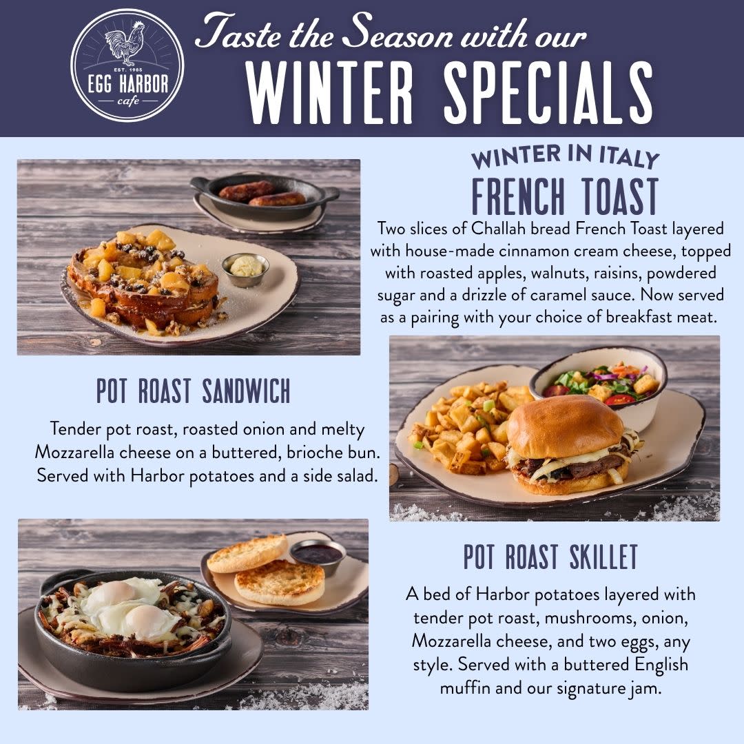 Egg Harbor Cafe's Winter specials are available from December 3rd through March 17th! Winter in Italy French Toast Two slices of Challah bread French Toast layered with house-made cinnamon cream cheese, topped with roasted apples, walnuts, raisins, powdered sugar and a drizzle of caramel sauce. Now served as a pairing with your choice of breakfast meat. Pot Roast Sandwich Tender pot roast, roasted onion and melty Mozzarella cheese on a buttered, brioche bun. Served with Harbor potatoes and a side salad. Pot Roast Skillet A bed of Harbor potatoes layered with tender pot roast, mushrooms, onion, Mozzarella cheese, and two eggs, any style. Served with a buttered English muffin and our signature jam Expiration Date : 3/17/2026