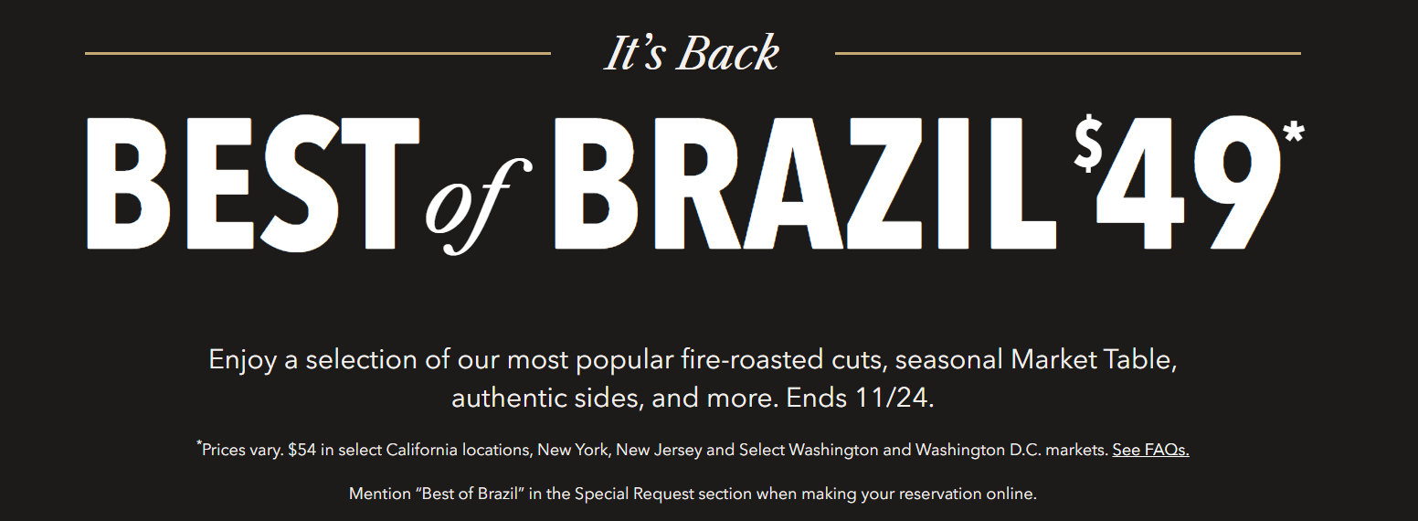 Enjoy a selection of our most popular fire-roasted cuts, seasonal Market Table, authentic sides, and more! All for just $49! Ends 11/24. Expiration Date : 11/24/2025 Promo Code : Best of Brazil