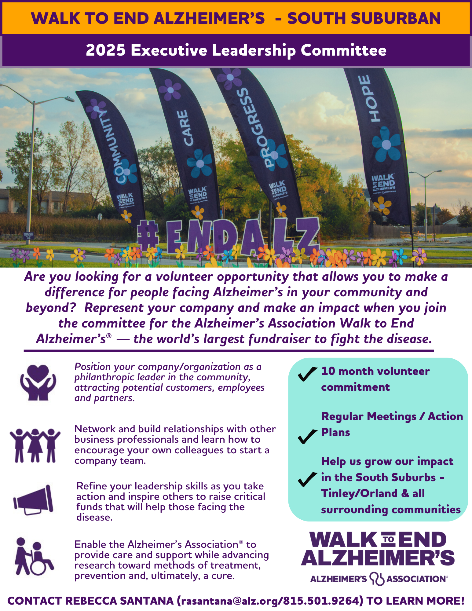 Job Type : Volunteer Education Level : Not Applicable Experience Level : Not Applicable Job Function : DevelopmentVOLUNTEER NEEDED - Executive Committee for Walk to End Alzheimer's - South Suburban